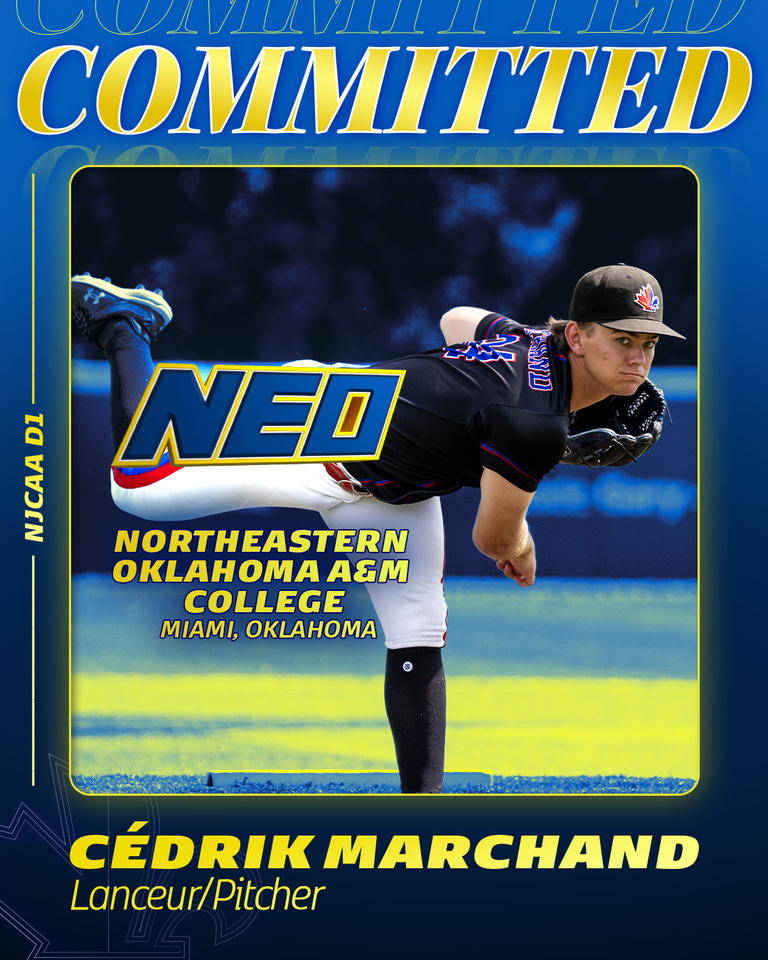 Le lanceur Cédrik Marchand, originaire de Trois-Rivières QC et issu du Sport-Études des Estacades de Trois-Rivières a choisi de poursuivre son rêve en s’engageant avec Northeastern Oklahoma A&M College à Miami, Oklahoma, un programme de la NJCAA, Division 1. Félicitations à Cédrik pour cette belle opportunité et bonne chance pour la suite!