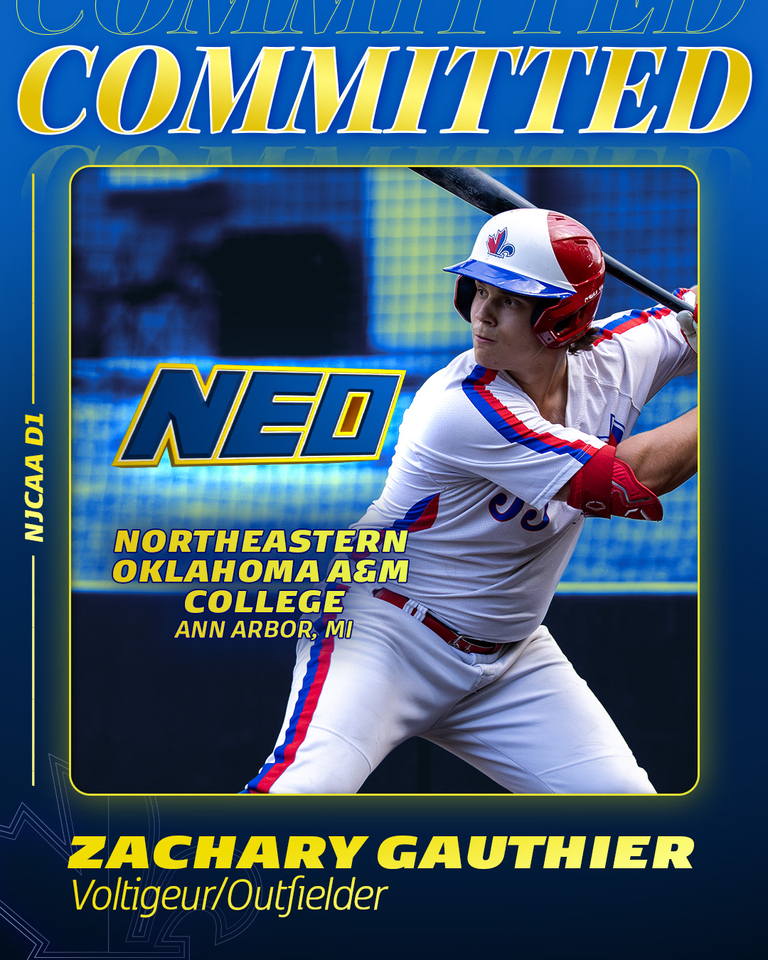 Le voltigeur Zachary Gauthier, originaire de Nicolet QC a choisi de poursuivre son rêve en s’engageant avec Northeastern Oklahoma A&M College à Miami, Oklahoma, un programme de la NJCAA, Division 1. Félicitations à Zachary pour cette belle opportunité et bonne chance pour la suite!