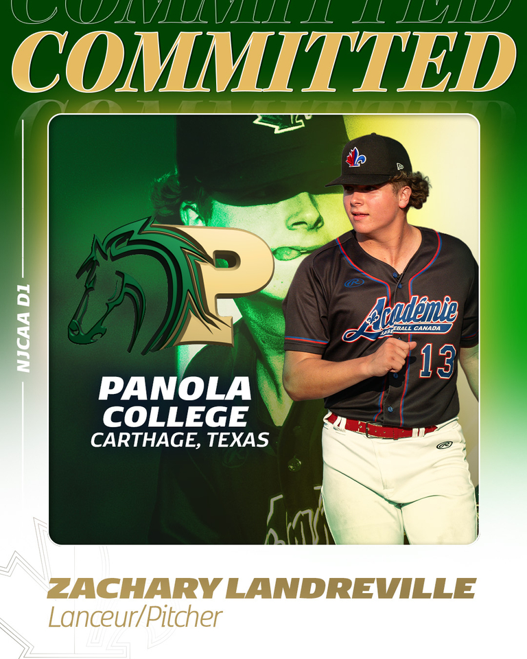 Academie Baseball Canada 2026 RHP Zachary Landreville from St-Jerome QC has announced his commitment to NJCAA Division 1 Panola College in Carthage, Texas to pursue his athletic and academic career. Congratulations to Zachary on this exciting opportunity !